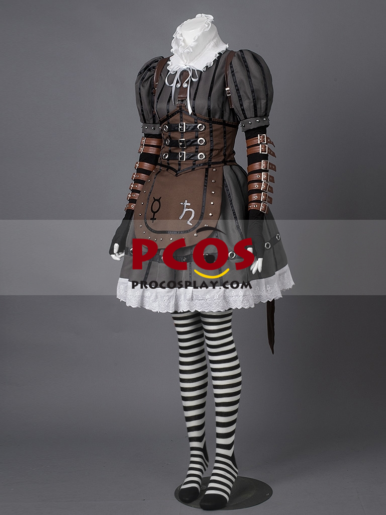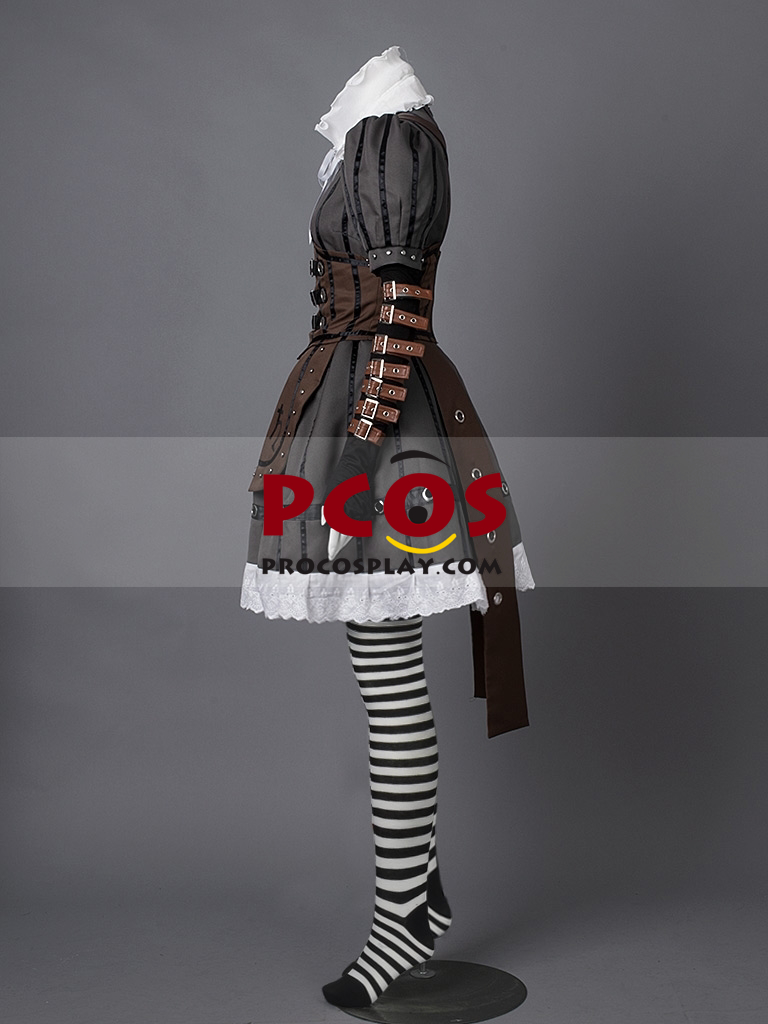 Click HERE to get this costume in 5-7 business days! Alice Madness Returns: Steam Dress for Cosplay includes A dark grey uniform skirt A brown uniform cloth apron A pair of striped black-and –white stockings A white gauze collar A pair of black fingerless gloves Fourteen brown leather buckles A silver alloy pendant
