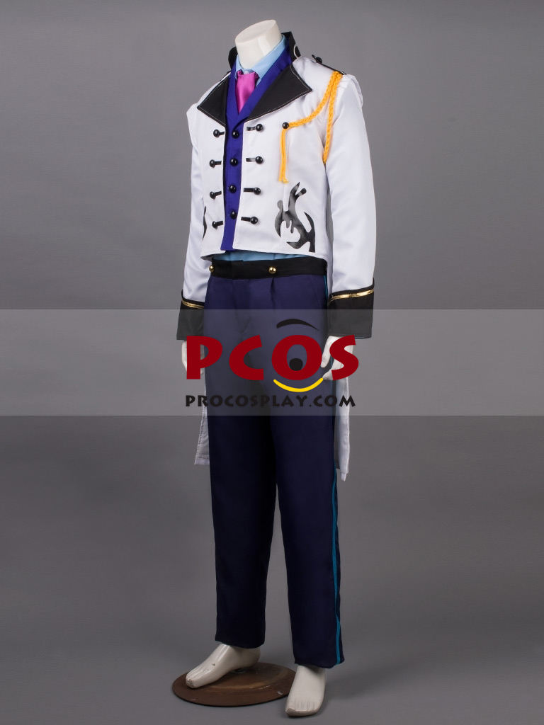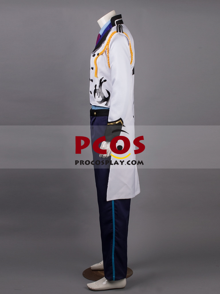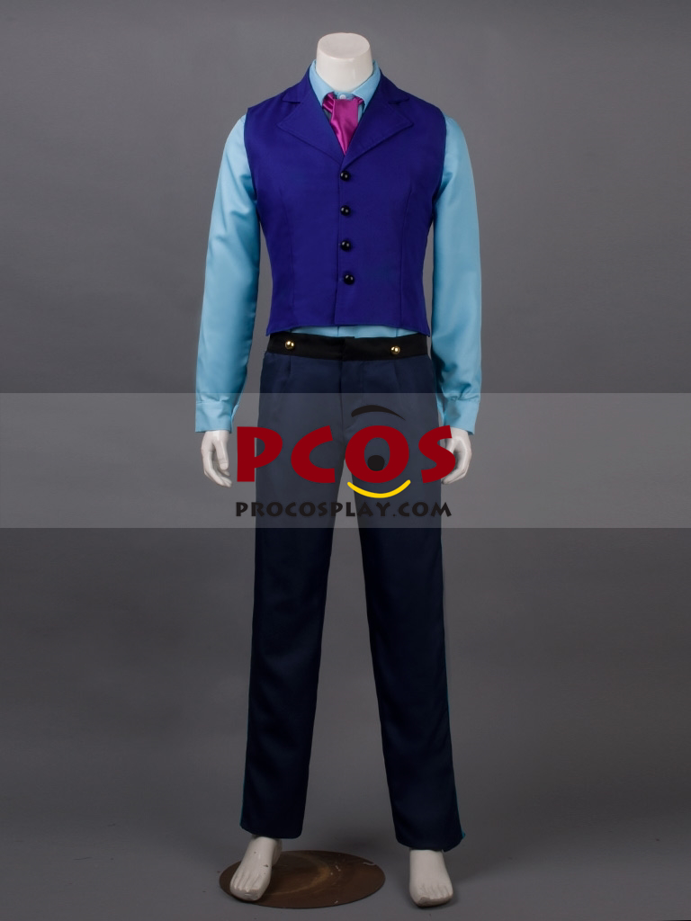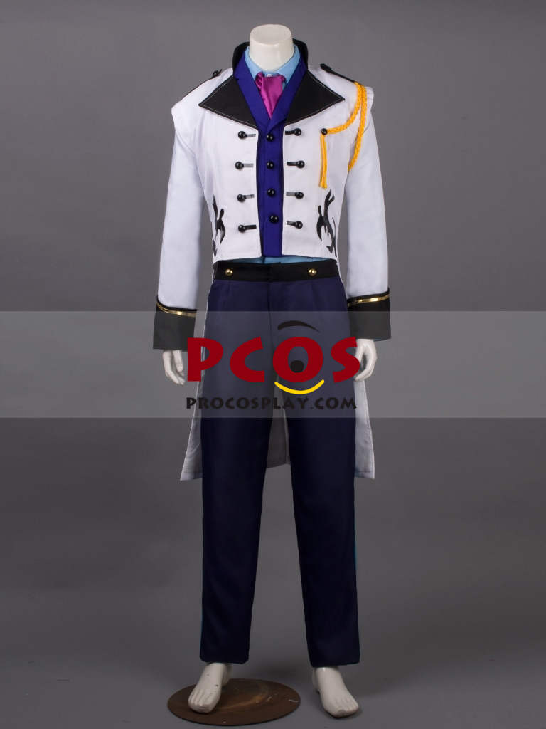Frozen Prince Hans Cosplay Costume includes A white uniform cloth tailcoat with black leather patterns prints on it and black collar An indigo uniform cloth vest A blue uniform cloth shirt A navy blue uniform cloth pants A magenta satin scarf