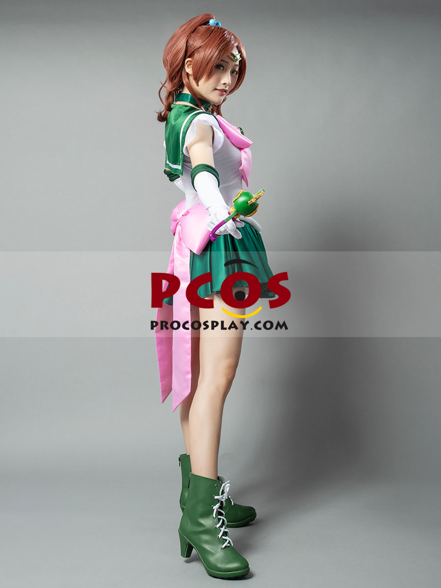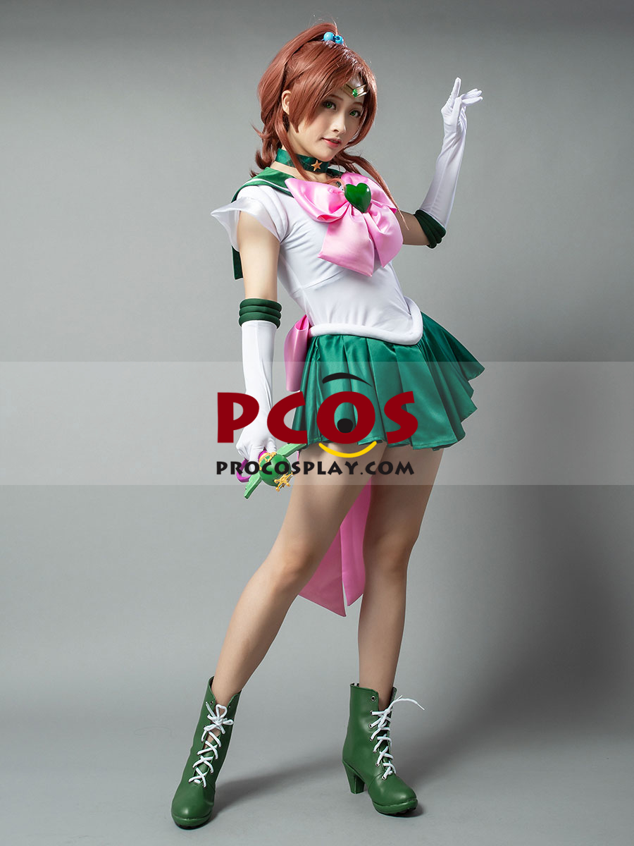 *The promotional products cannot be returned or changed once sold. Sailor Moon Super S Film Sailor Jupiter Makoto Kino Lita Cosplay Costumes includes A white spandex dress with green high density collar, white gauze shoulder pads, white stripe filled with cotton figurine separate the green high density satin pleated skirt which has yarn petticoat inside A green choker with golden star resin gem attached on it A pink high density satin bow with a green heart shape resin transformation brooch A pink high density satin bow on the back A pair of white spandex gloves with dark green elbow fittings filled with cotton figurine A golden tiara with a green resin gem in the middle A blue elastic hairband with blue beads