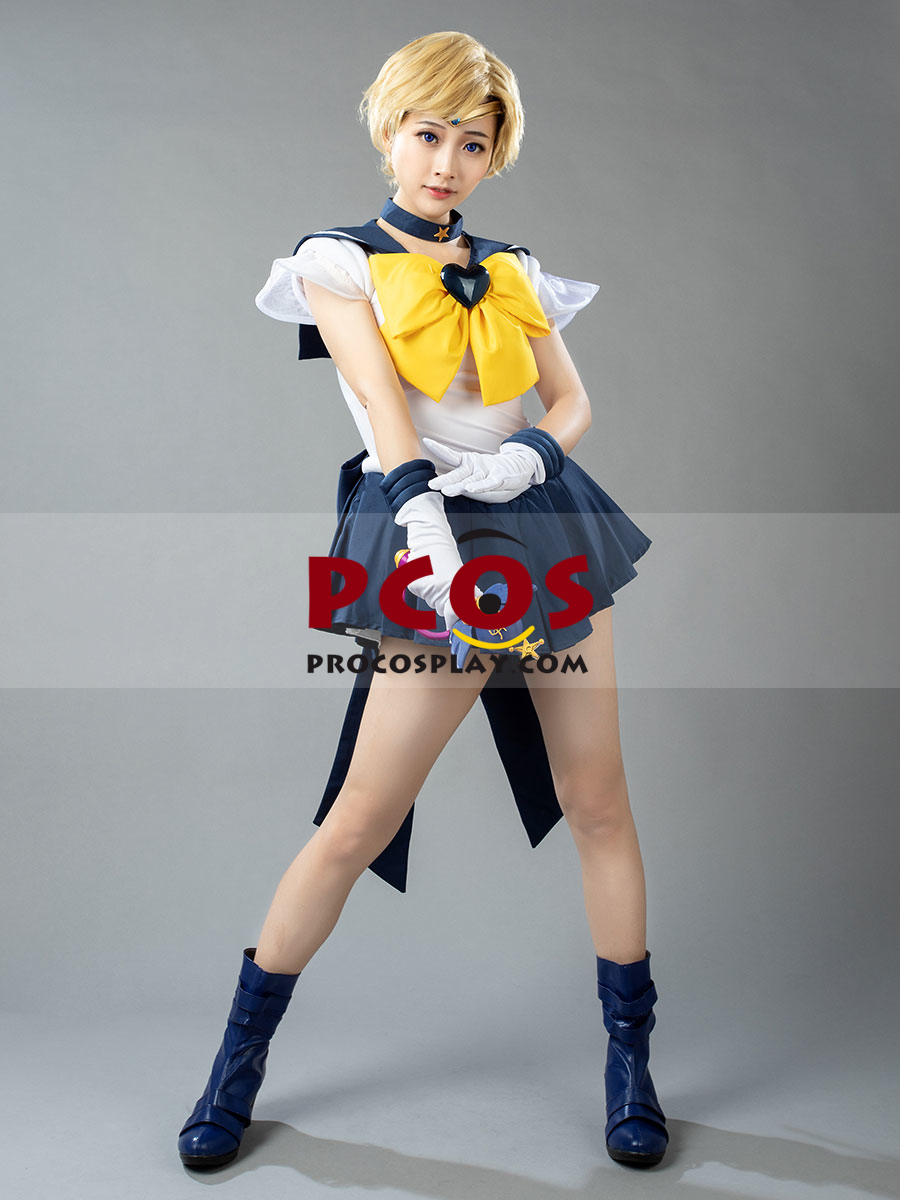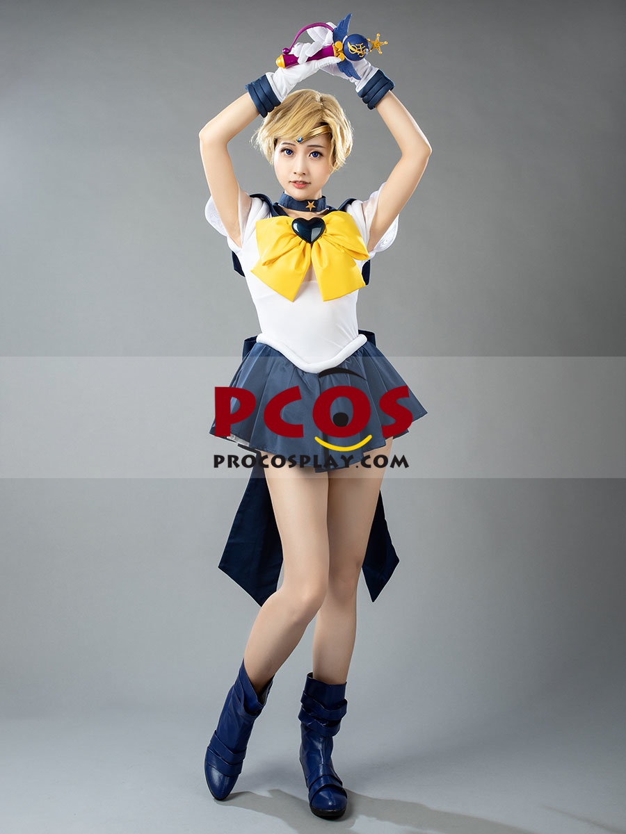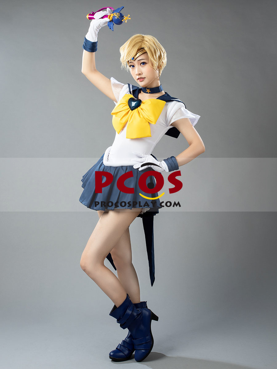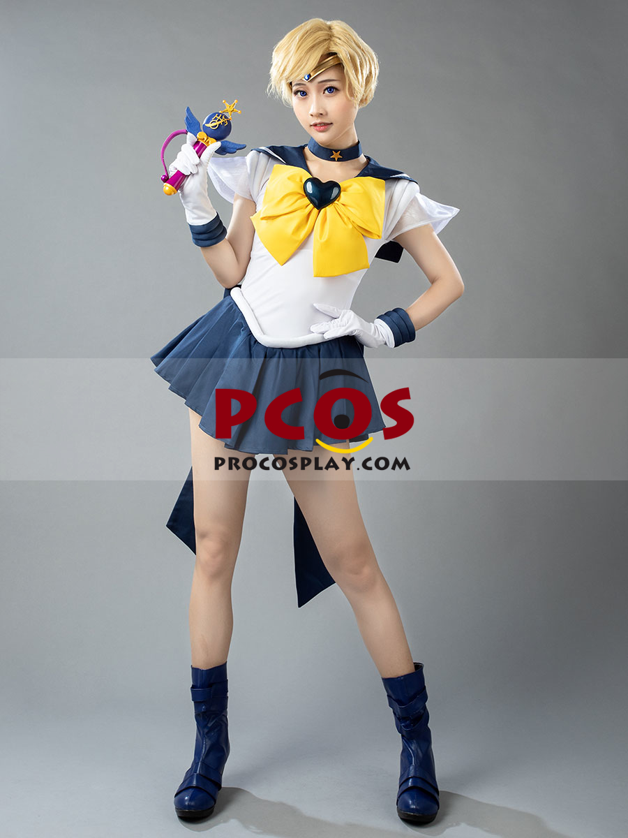 Sailor Moon Super S Film Sailor Uranus Haruna Tenoh Amara Cosplay Costumes includes A white spandex dress with navy-blue high density satin collar, white gauze shoulder pads, white stripe filled with cotton figurine separate the navy-blue high density satin skirt which has a yarn petticoat inside A yellow high density satin bow with navy-blue heart shape transformation brooch A navy-blue high density satin bow on the back A navy-blue choker with a golden resin star on it A golden tiara with a blue resin gem A pair of white spandex gloves with dark blue wrist fittings filled with cotton figurine