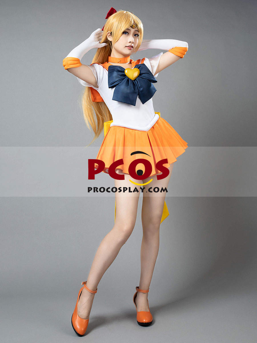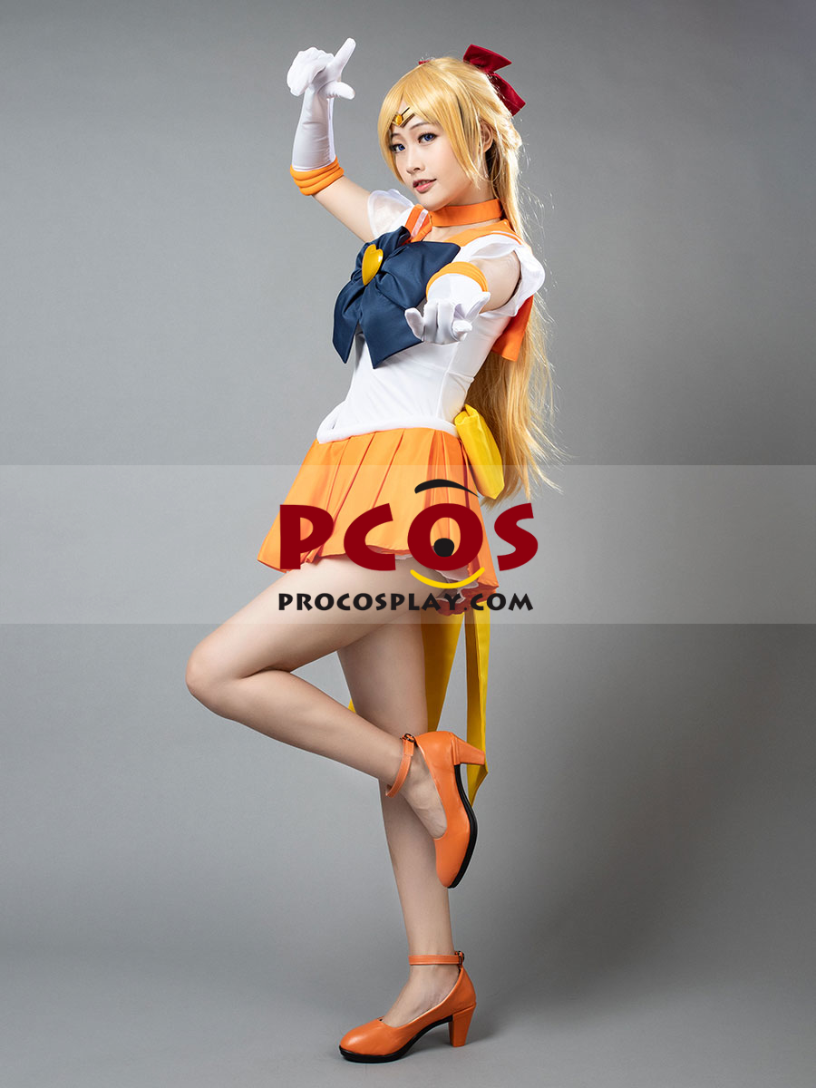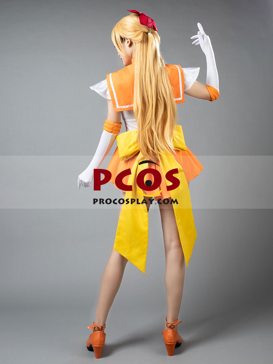 Sailor Moon Super S Film Minako Aino Mina Cosplay Costumes includes A white spandex leotard dress with orange high density satin collar, white gauze cuffs and white stripe filled with cotton figurine separate the orange high density satin pleated skirt which has yarn petticoat inside A choker with golden star on the middle A navy-blue high density satin bow with a golden heart shape resin transformation brooch A light orange high density satin bow on the back A pair of white spandex gloves with orange elbow fittings filled with cotton figurine A red high density satin bow hairband A golden tiara with a light orange resin gem in the middle