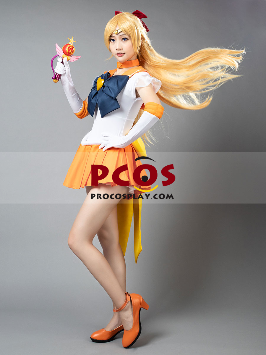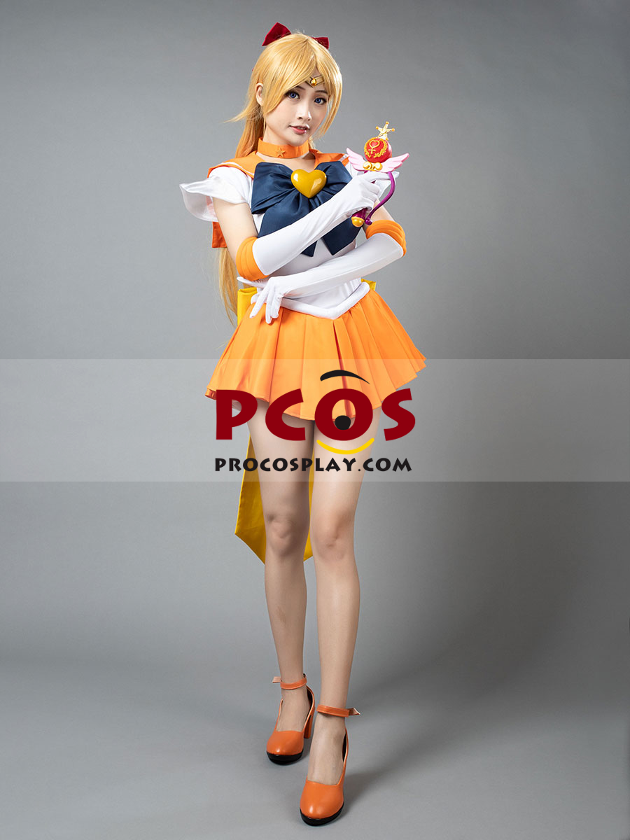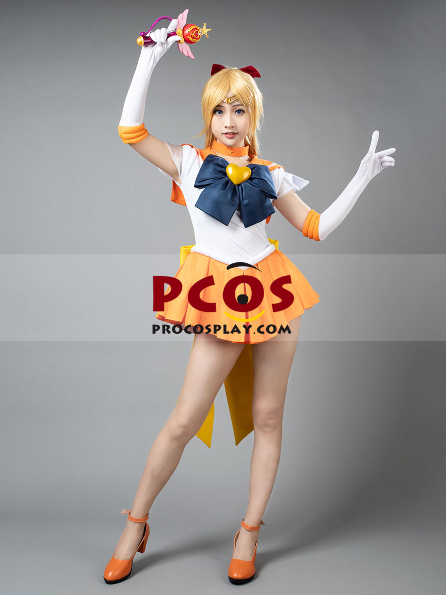 Sailor Moon Super S Film Minako Aino Mina Cosplay Costumes includes A white spandex leotard dress with orange high density satin collar, white gauze cuffs and white stripe filled with cotton figurine separate the orange high density satin pleated skirt which has yarn petticoat inside A choker with golden star on the middle A navy-blue high density satin bow with a golden heart shape resin transformation brooch A light orange high density satin bow on the back A pair of white spandex gloves with orange elbow fittings filled with cotton figurine A red high density satin bow hairband A golden tiara with a light orange resin gem in the middle